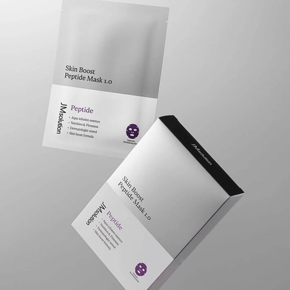 Тканевая маска-бустер с пептидами JMSOLUTION Skin Boost Peptide Mask 1.0 способствует разглаживанию заломов и уменьшению глубины морщин, замедляет процессы старения. Повышает тургор и уплотняет, активизирует синтез коллагена и увеличивает эластичность тканей. Содержит комплекс пептидов, морскую воду, пробиотики, гиалуроновую кислоту и экстракт сои.